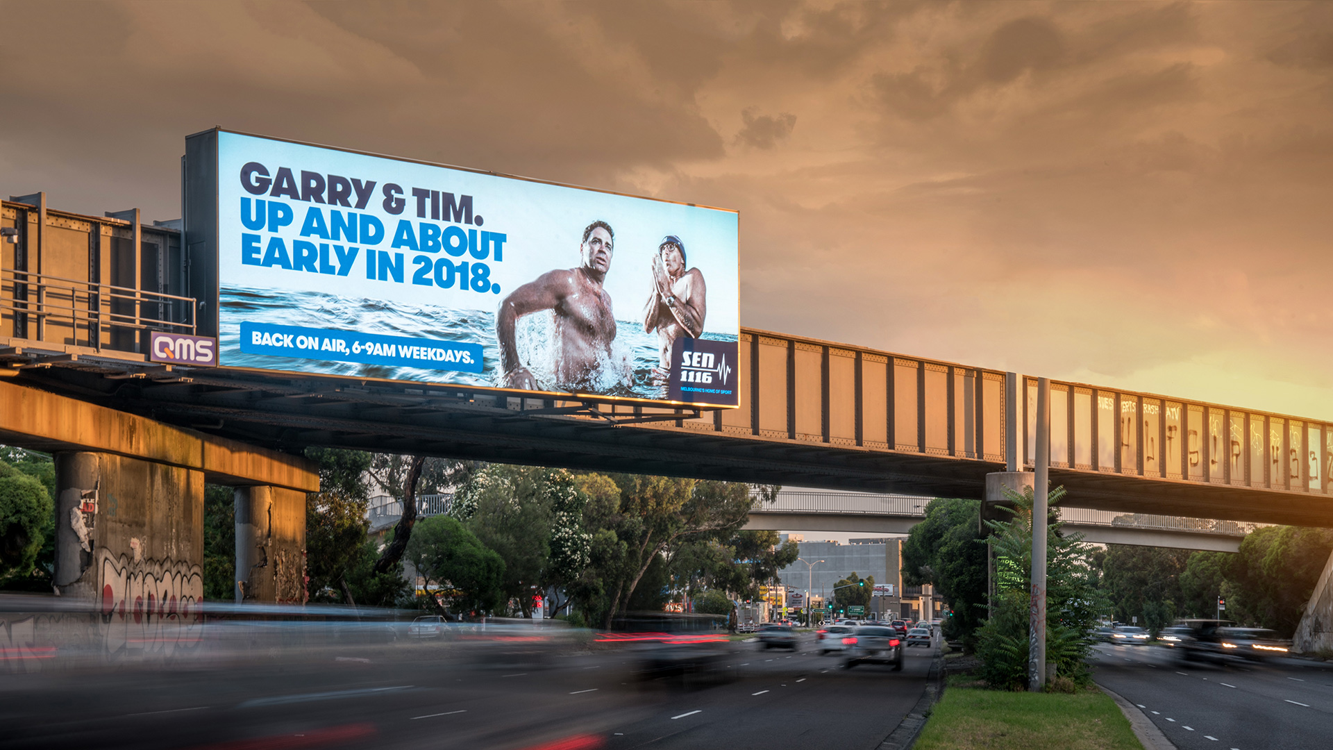 When the team at Thread Communications approached us to shoot a series of images for the re-launch of the SEN Footy show we were excited to hear that they were hoping to create something different to the standard celebrity line up traditionally seen on news, tv and radio promos. The idea was to capture the shows stars Tim Watson and Garry Lyon in a dawn post training recovery session, in the bay just like the good ol’ days when the lads were playing full time. This meant we literally had to jump in the deep end, taking our expensive strobe lighting, camera gear and production team into a stormy Port Phillip bay as Tim and Garry performed their best match fit poses. Due to tight schedules and incoming weather we had limited time to shoot, but managed to get some dramatic shots that hopefully captured the guys energy and humour. The campaign was featured all over Melbourne and for a few days according to the media were the “Most Talked about Billboards in Melbourne”.